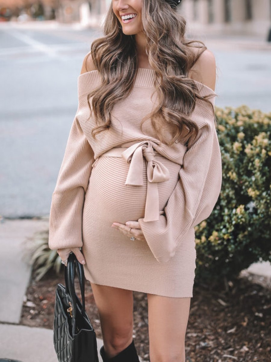 Maternity Fashion V-neck Solid Color Lace-up Knit Dress
